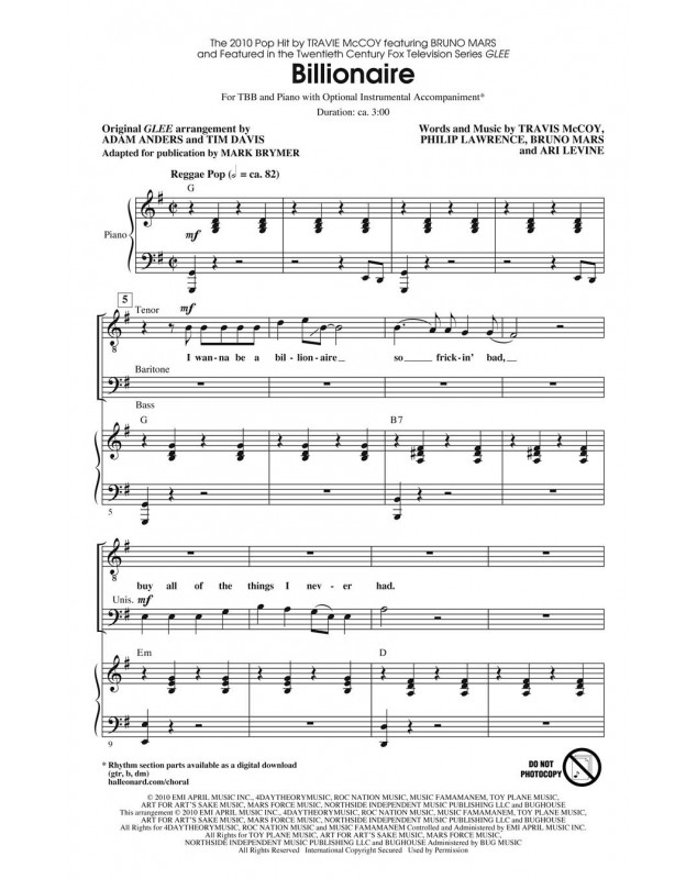 Ari Levine_Bruno Mars_Philip Lawrence_Travie McCoy Adam Anders_Tim Davis Mark Brymer Billionaire (featured in Glee) Choeur CD Pop Choral Series Hymnes et chorals 46
