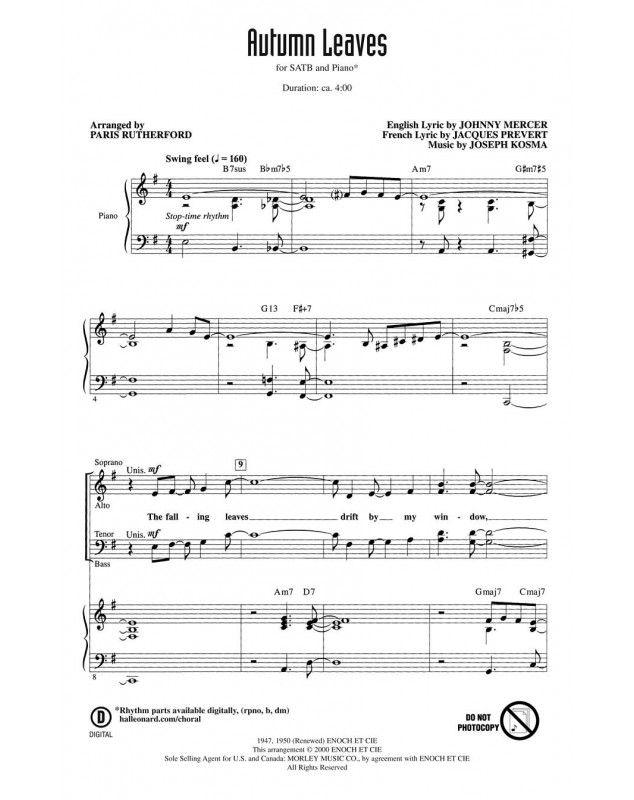 Jacques Prevert_Johnny Mercer_Joseph Kosma Paris Rutherford Autumn Leaves (IPACK) Les Feuilles Mortes Combo Set de partitions Jazz Chorals Jazz 66