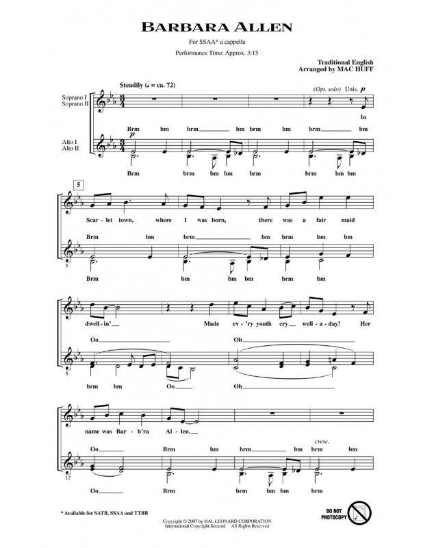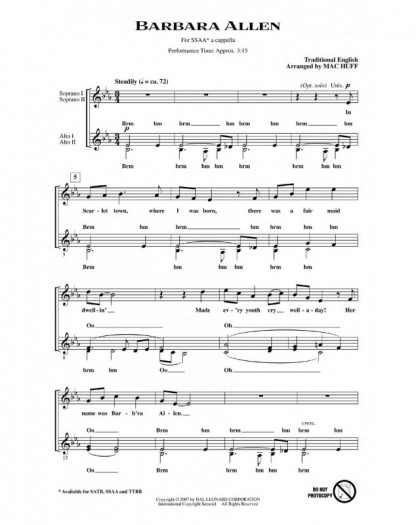 Traditional Mac Huff Barbara Allen SSAA a Cappella