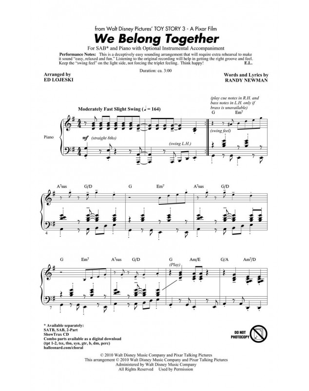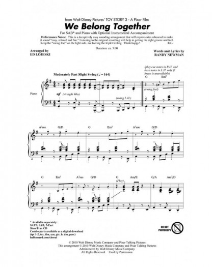 Randy Newman Ed Lojeski We Belong Together (from Toy Story 3) SAB and Piano