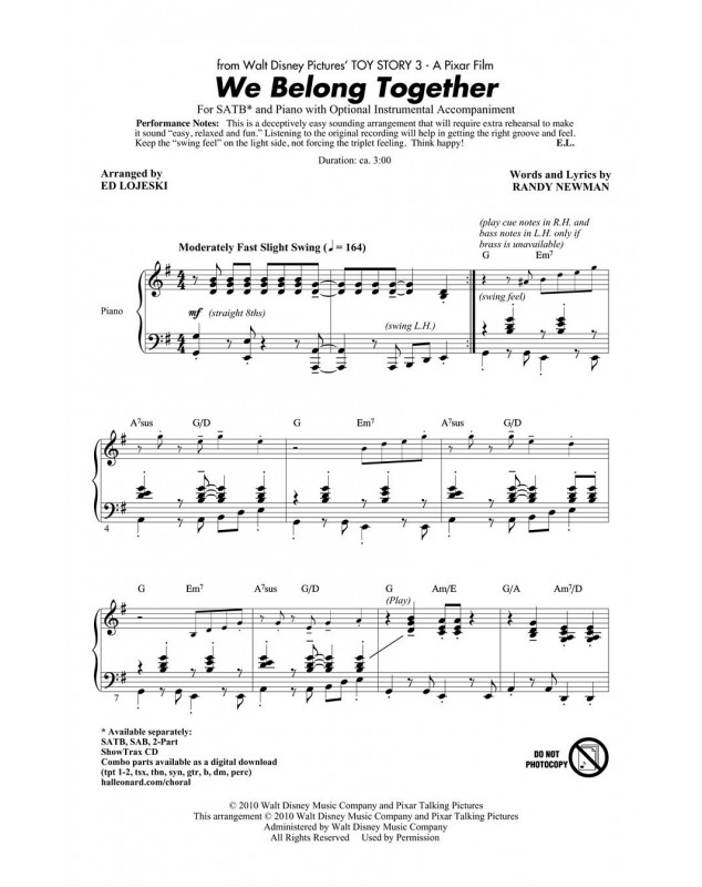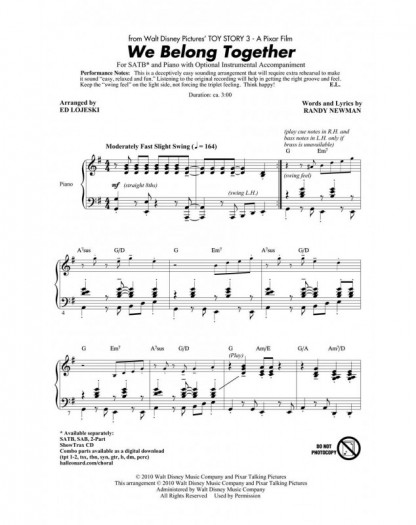 Randy Newman Ed Lojeski We Belong Together from Toy Story 3 Choeur