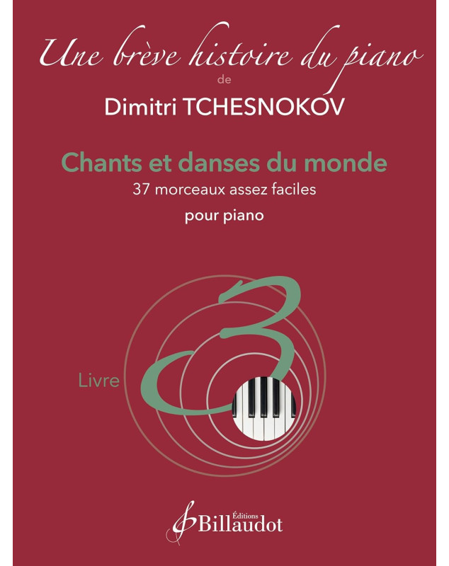 Fruit de nombreuses recherches pianistiques personnelles et d’années d’expérience d’enseignement, Une Brève Histoire du Piano offre un répertoire qui s’adresse à tous les amoureux du piano. Ce troisième livre propose un ensemble de 37 œuvres assez faciles, inspirées de différents endroits ou régions du monde.Alors que certaines pièces décrivent une nostalgie ou un souvenir, d’autres sont le fruit d’une imagination nourrie d’éléments typiques. Huit autres livres sont proposés, détaillés plus bas.
