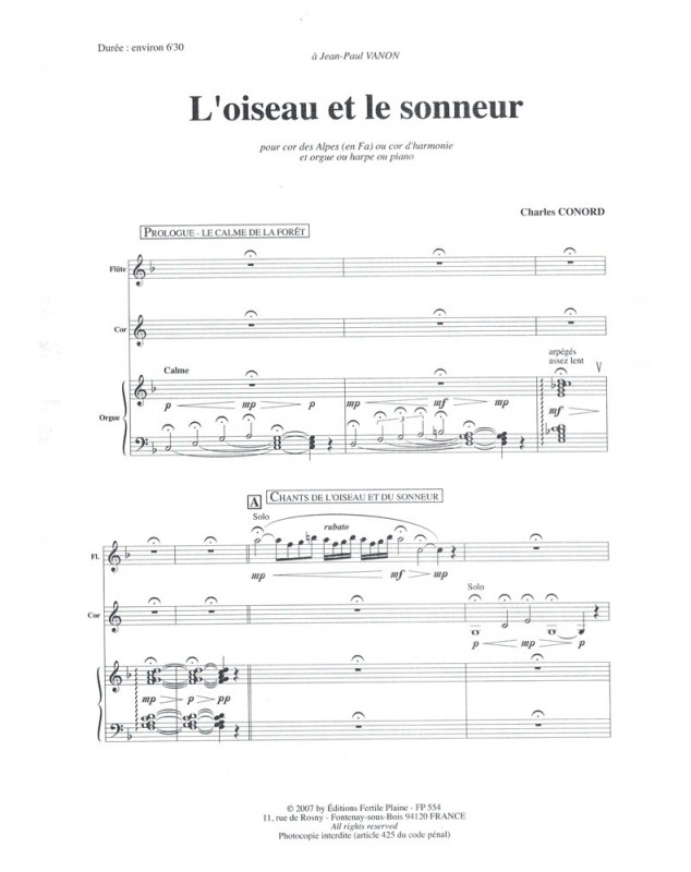 L'Oiseau et Le Sonneur Charles Conord Flute, Alphorn and Organ Set de partitions