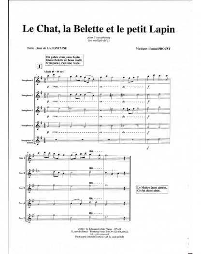 Le Chat, La Belette et Le Petit Lapin Pascal Proust 5 Saxophone's Set de partitions