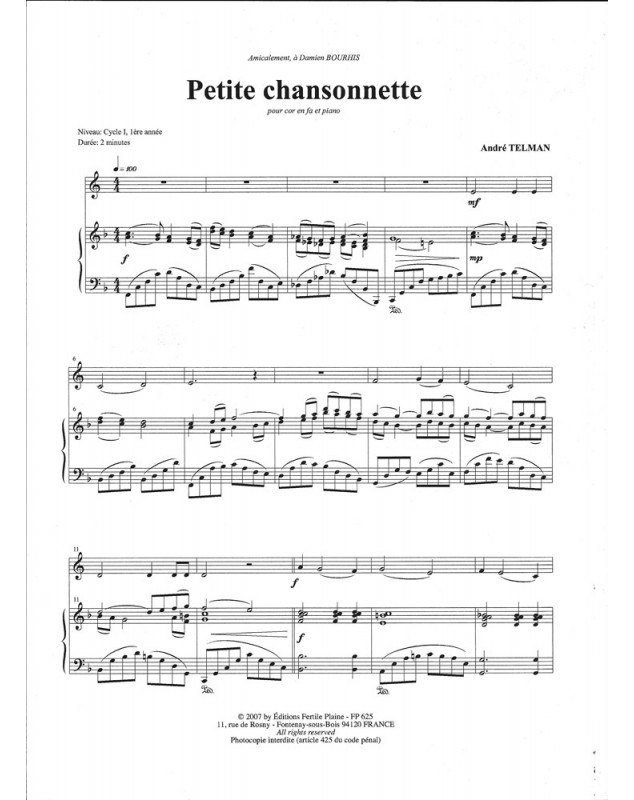 Petite Chansonnette André Telman Cor et Piano Recueil + Partition
