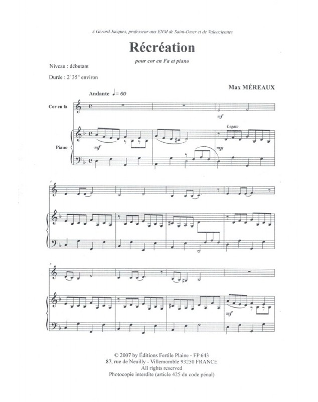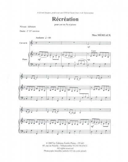 Recreation Max Mereaux Cor et Piano Recueil + Partition