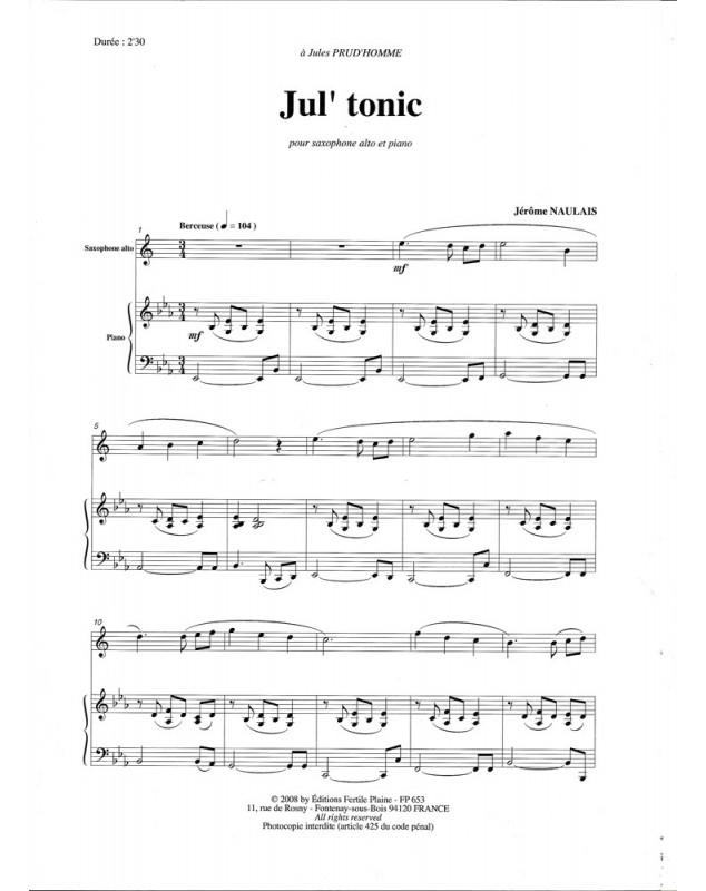 Jul'Tonic Jérôme Naulais Saxophone Alto et Piano Recueil + Partition