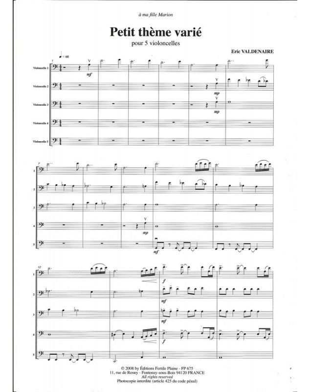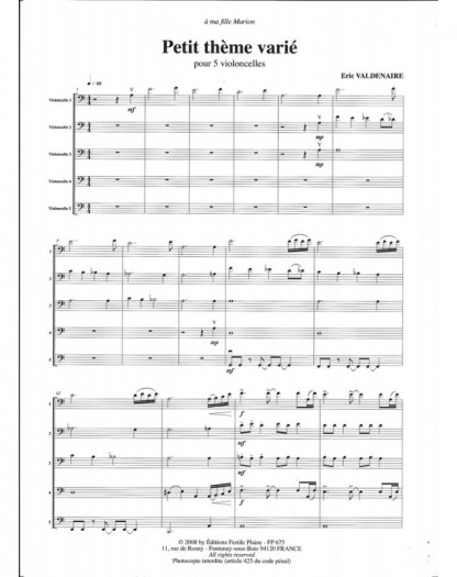 Petit Thème Varié Eric Valdenaire 5 Cello's Set de partitions