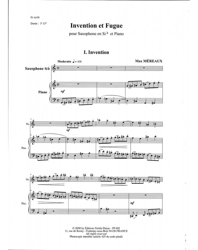 Invention et Fugue Max Mereaux Saxophone Ténor et Piano Recueil + Partition
