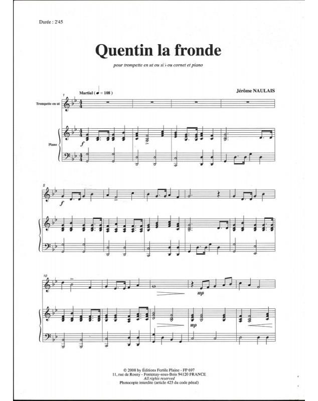 Quentin La Fronde Jérôme Naulais Trompette et Piano Recueil + Partition