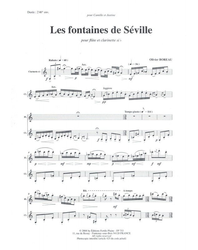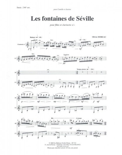 Les Fontaines De Seville Olivier Boreau Flûte Traversière et Clarinette Recueil