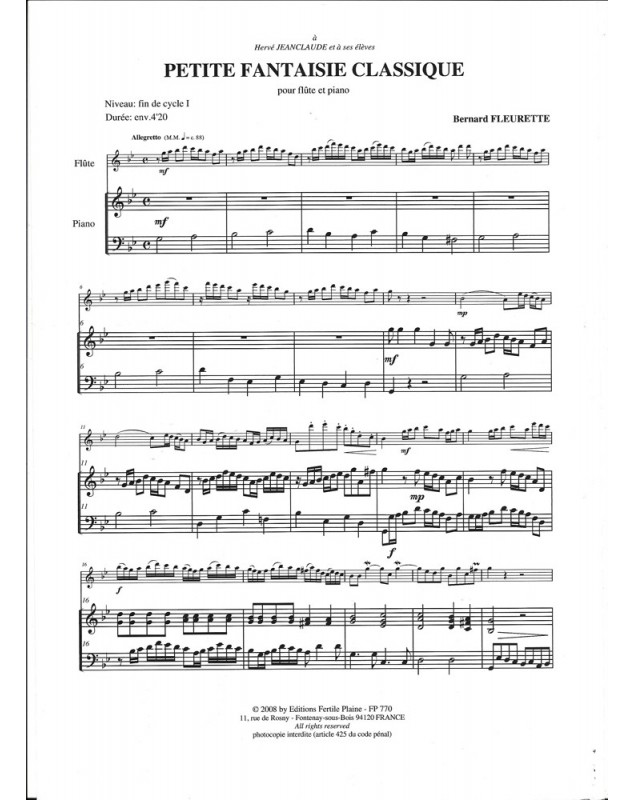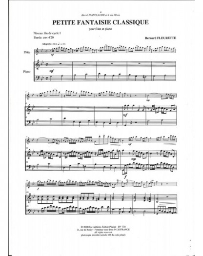 Petite Fantaisie Classique Bernard Fleurette Flûte Traversière et Piano Recueil + Partition