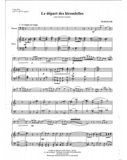 Le Départ Des Horondelles Philippe Durand Basson et Piano Recueil + Partition