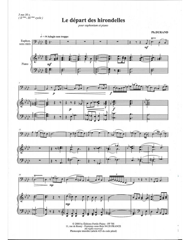 Le Départ Des Hirondelles Philippe Durand Euphonium et Piano Recueil + Partition