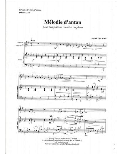 Mélodie D'antan André Telman Trompette et Piano Recueil + Partition