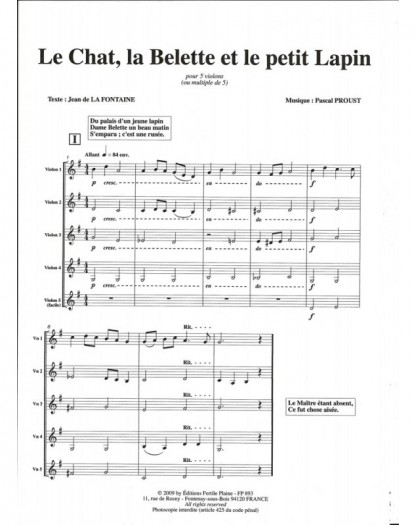 Le Chat, La Belette et Le Petit Lapin Pascal Proust 4 Violins Set de partitions