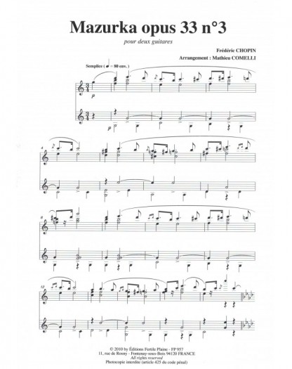 Mazurka Op 33 N° 3 Frédéric Chopin Mathieu Comelli 2 Guitars Recueil