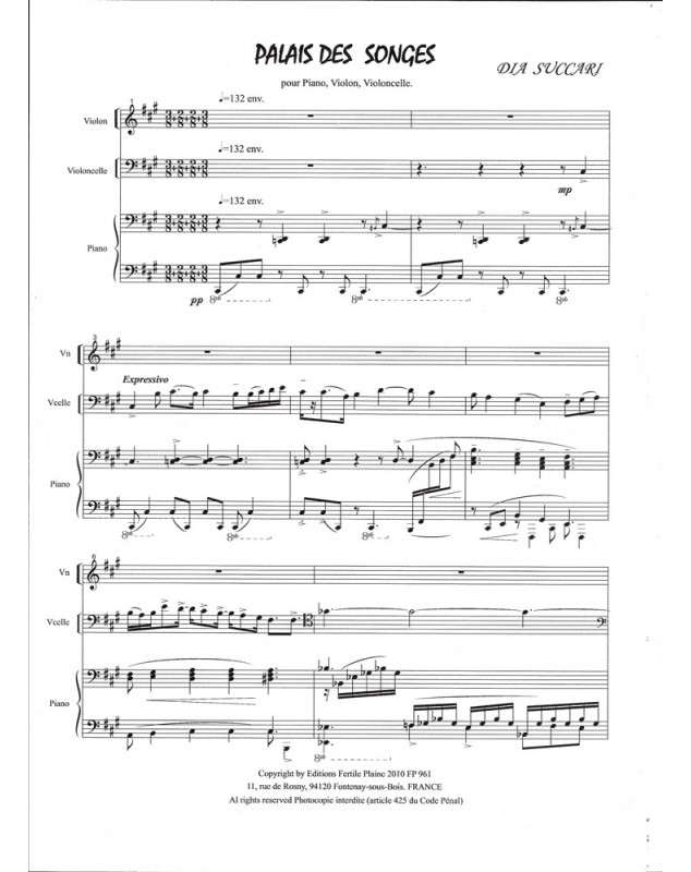 Palais Des Songes Dia Succari Violon, Violoncelle et Piano Set de partitions