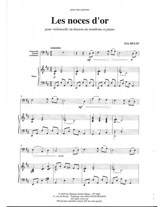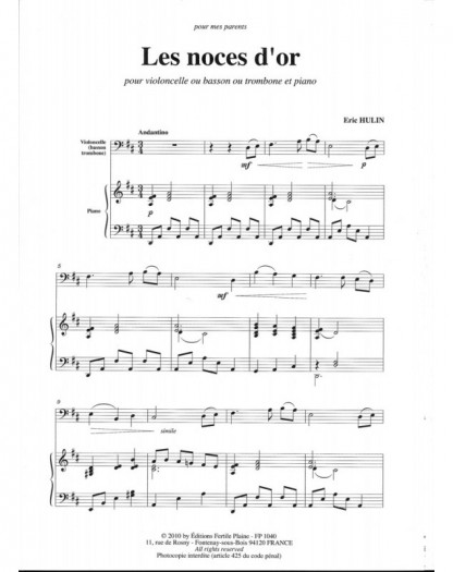 Les Noces D'or Eric Hulin Trombone et Piano Recueil + Partition