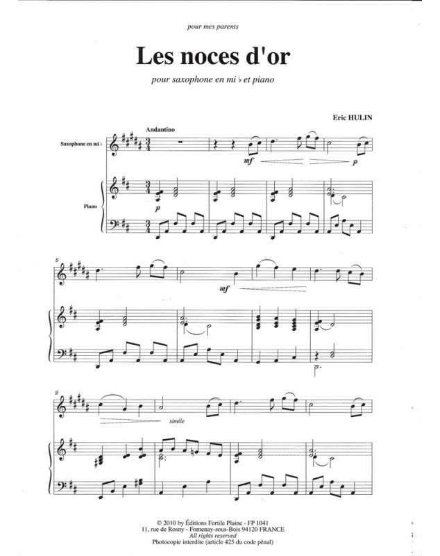 Les Noces D'or Eric Hulin Saxophone Alto et Piano Recueil + Partition