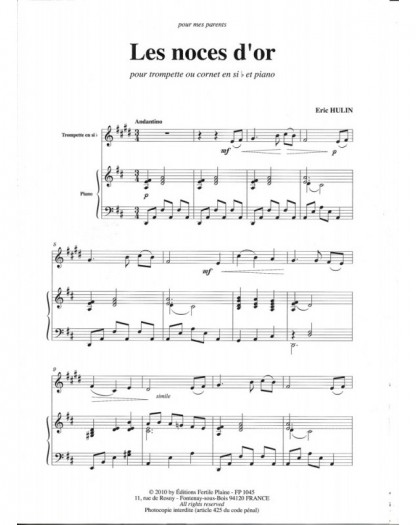 Les Noces D'or Eric Hulin Trompette et Piano Recueil + Partition