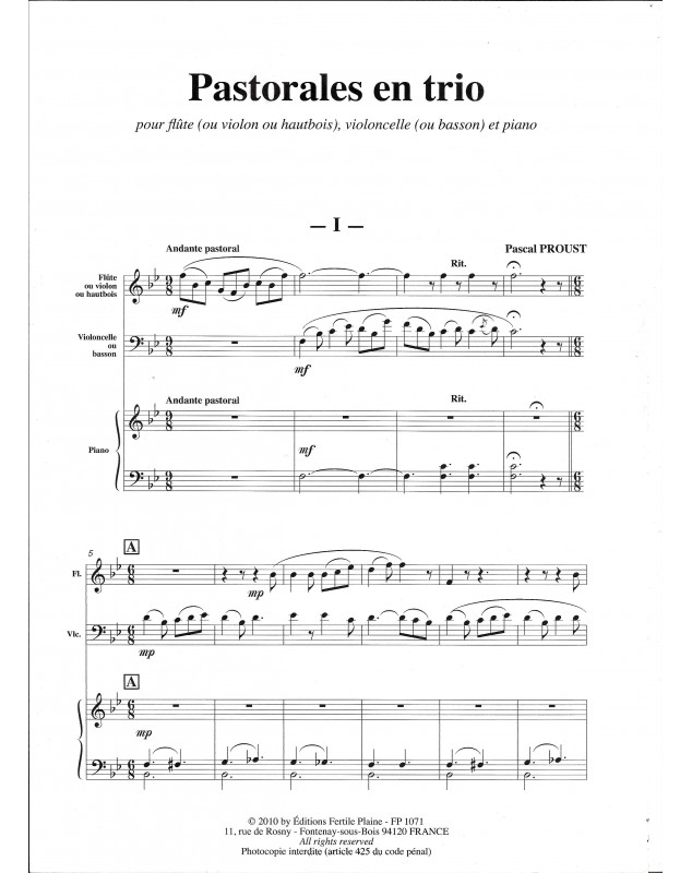 Pastorales En Trio Pascal Proust Flute, Cello and Piano Recueil + Partition