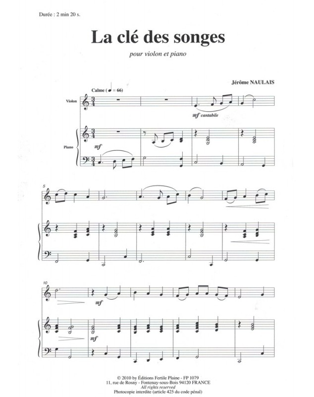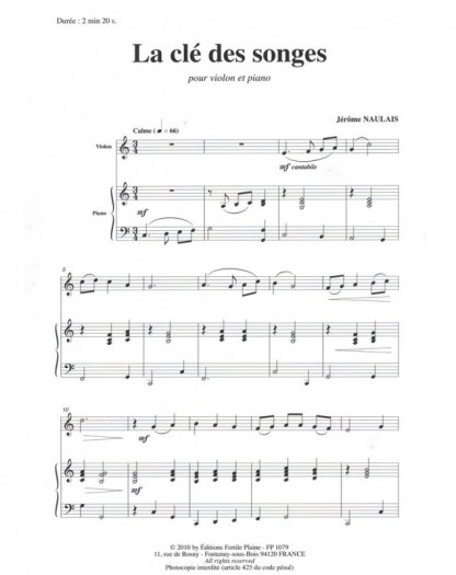 La Clé Des Songes Jérôme Naulais Violon et Piano Recueil + Partition