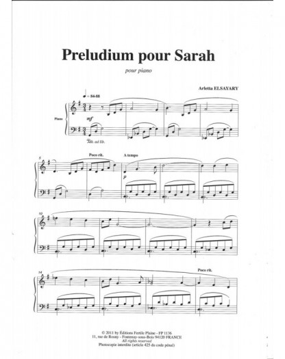 Préludium Pour Sarah Arletta Elsayary Piano Recueil