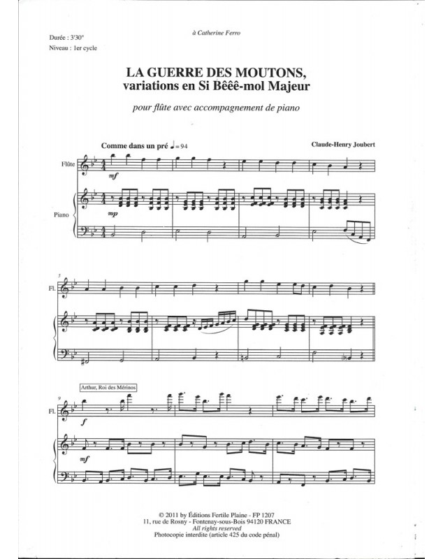 La Guerre Des Moutons Claude-Henry Joubert Flûte Traversière et Piano Recueil + Partition