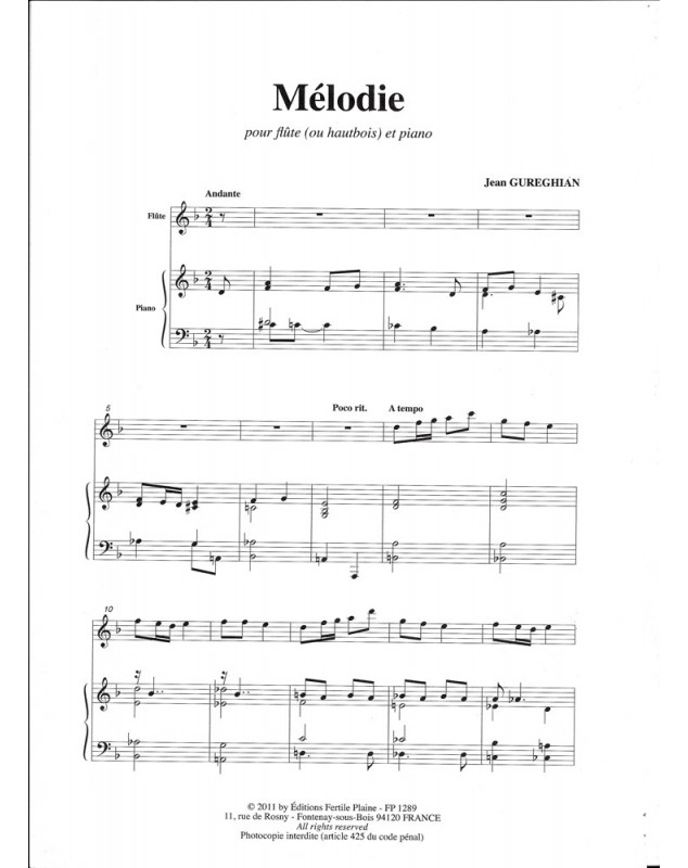 Mélodie Jean Gureghian Flûte Traversière et Piano Recueil + Partition