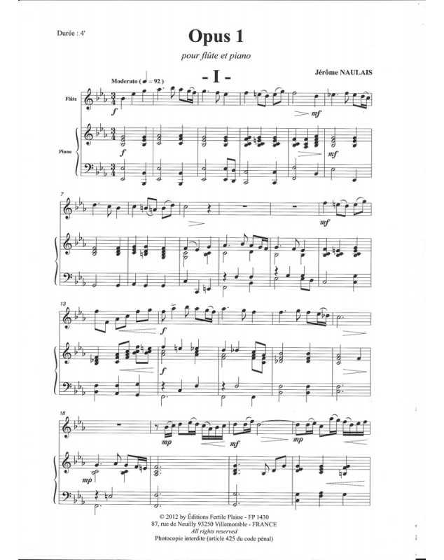 Opus 1 Jérôme Naulais Flûte Traversière et Piano Recueil + Partition