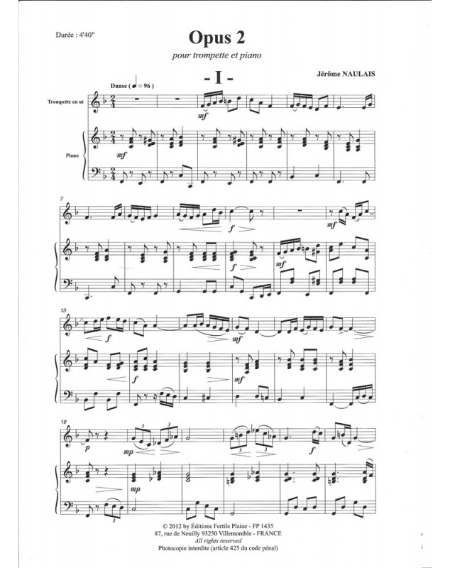 Opus 2 Jérôme Naulais Trompette et Piano Recueil + Partition
