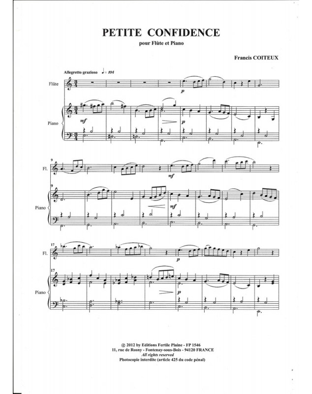 Petite Confidence Francis Coiteux Flûte Traversière et Piano Recueil + Partition