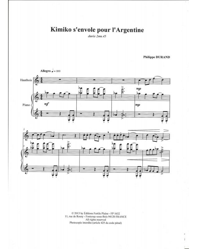 Kimiko S'Envole Pour L'argentine Philippe Durand Hautbois et Piano Recueil + Partition