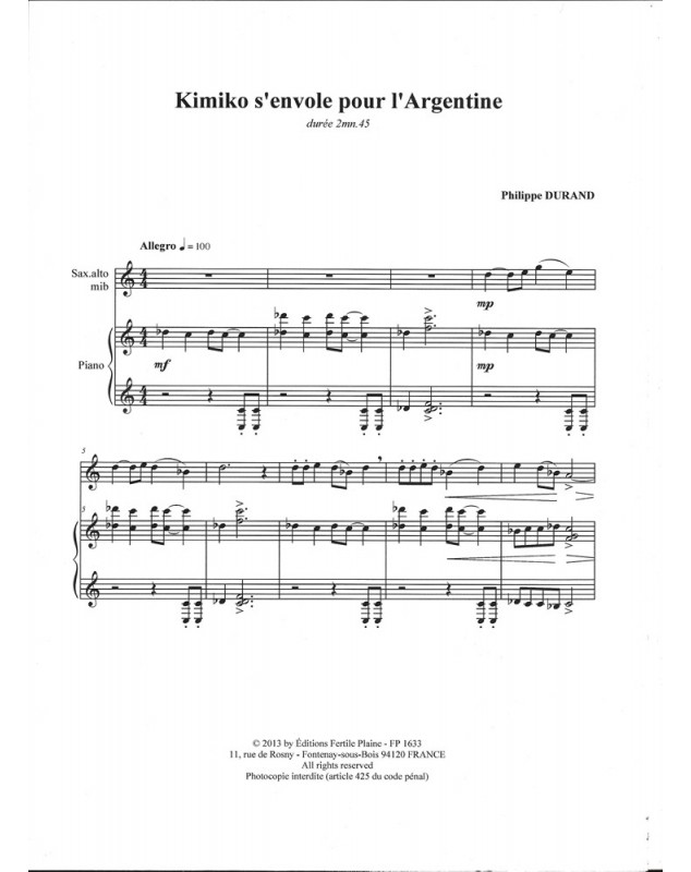 Kimiko S'Envole Pour L'argentine Philippe Durand Saxophone et Piano Recueil + Partition