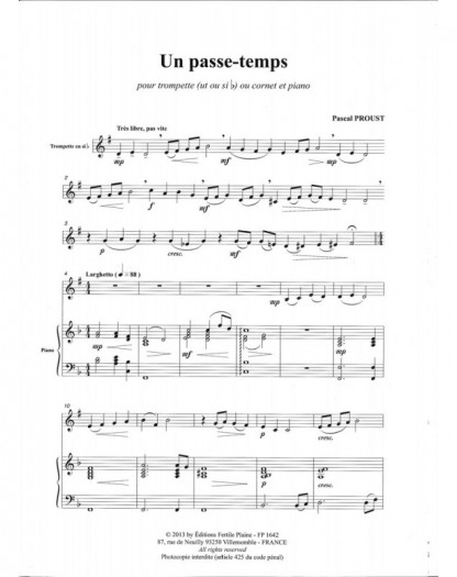 Passe-Temps Pascal Proust Trompette et Piano Recueil + Partition
