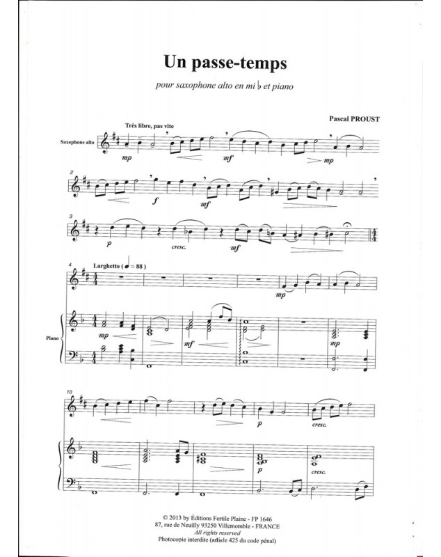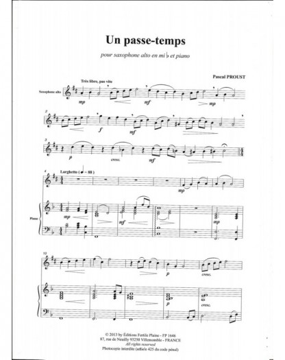 Passe-Temps Pascal Proust Saxophone Alto et Piano Recueil + Partition