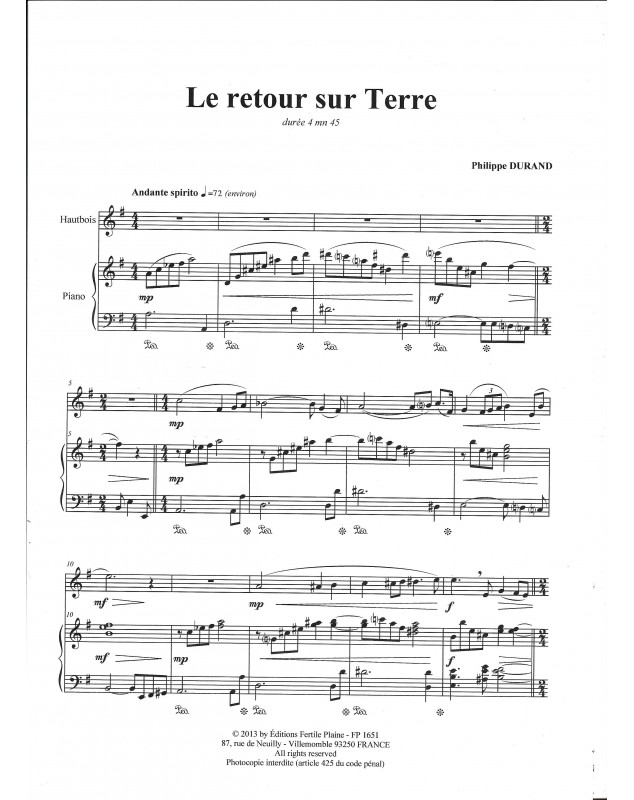 Le Retour Sur Terre Philippe Durand Hautbois et Piano Recueil + Partition