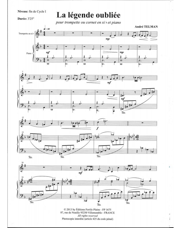 Légende Oubliée André Telman Trompette et Piano Recueil + Partition
