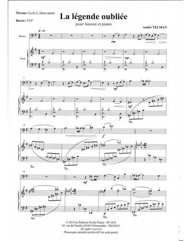Légende Oubliée André Telman Basson et Piano Recueil + Partition