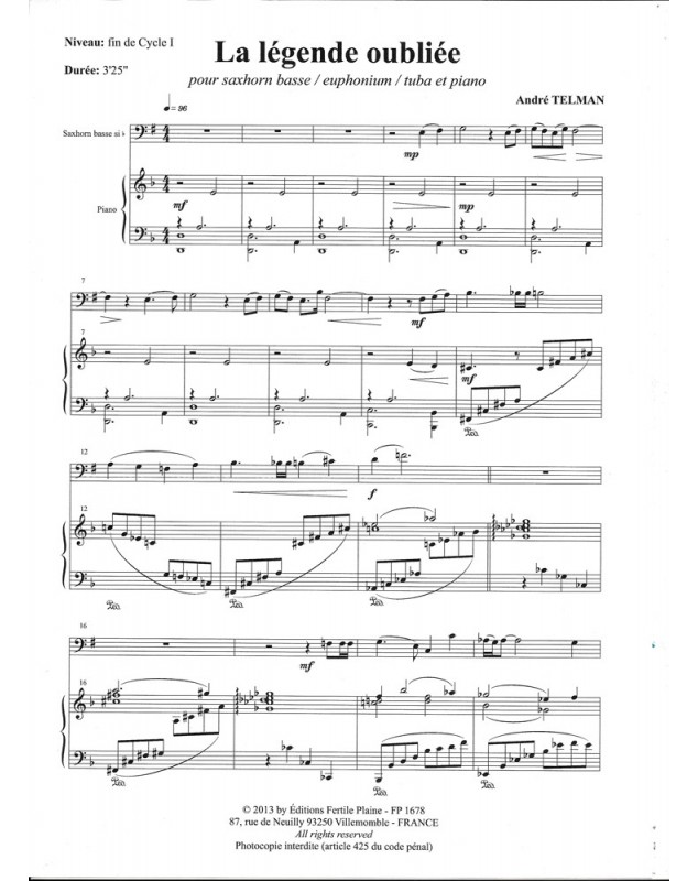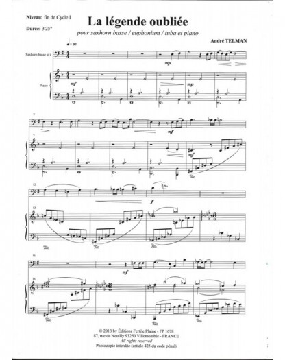 La Légende Oubliée André Telman Euphonium et Piano Recueil + Partition