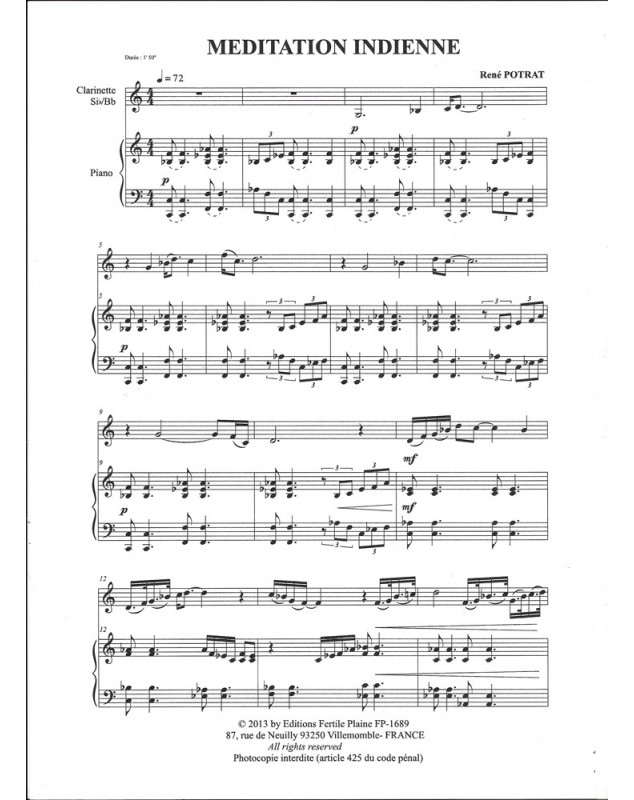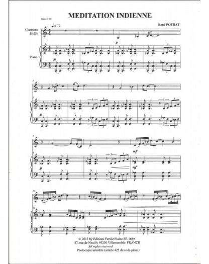 Méditation Indienne René Potrat Clarinette et Piano Recueil + Partition
