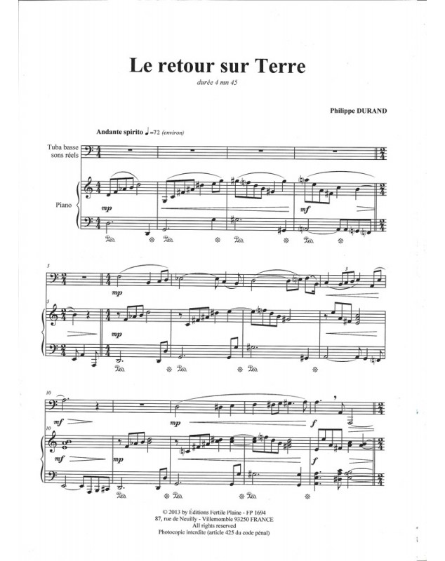 Le Retour Sur Terre Philippe Durand Tuba et Piano Recueil + Partition