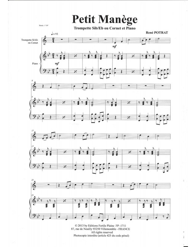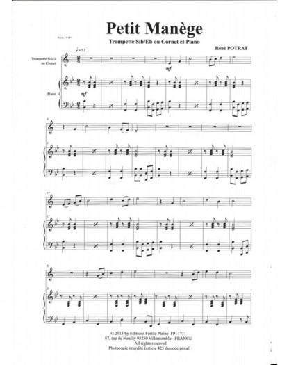 Le Petit Manège René Potrat Trompette et Piano Recueil + Partition