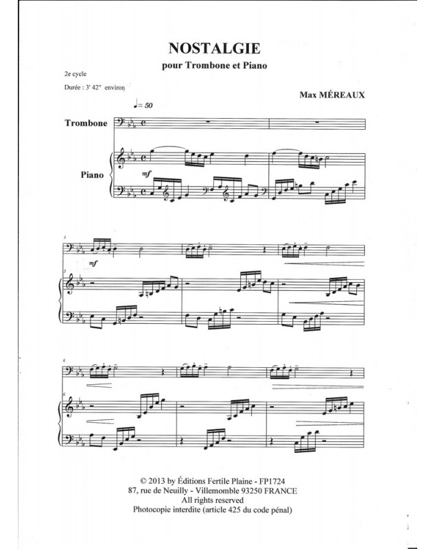 Nostalgie Max Mereaux Trombone et Piano Recueil + Partition