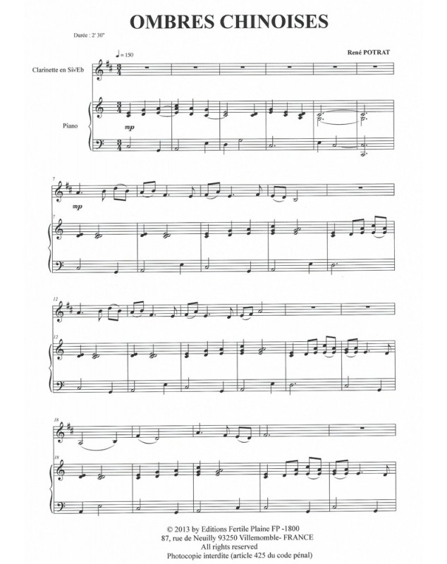 Ombres Chinoises René Potrat Clarinette et Piano Recueil + Partition