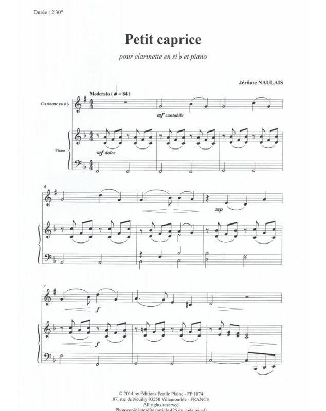 Petit Caprice Jérôme Naulais Clarinette et Piano Recueil + Partition