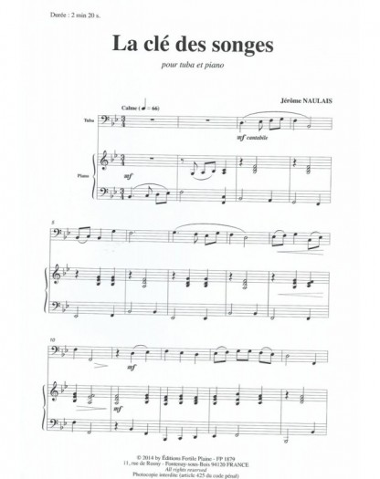 La Clé Des Songes Jérôme Naulais Tuba et Piano Recueil + Partition