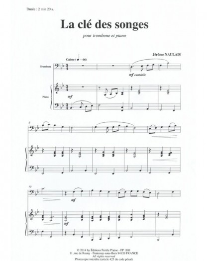 La Clé Des Songes Jérôme Naulais Trombone et Piano Recueil + Partition