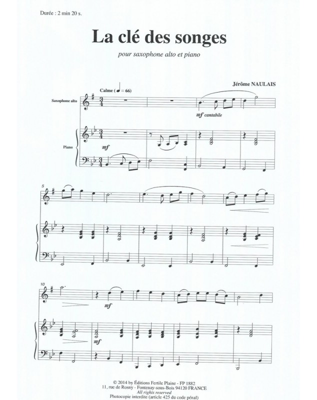 La Clé Des Songes Jérôme Naulais Saxophone et Piano Recueil + Partition